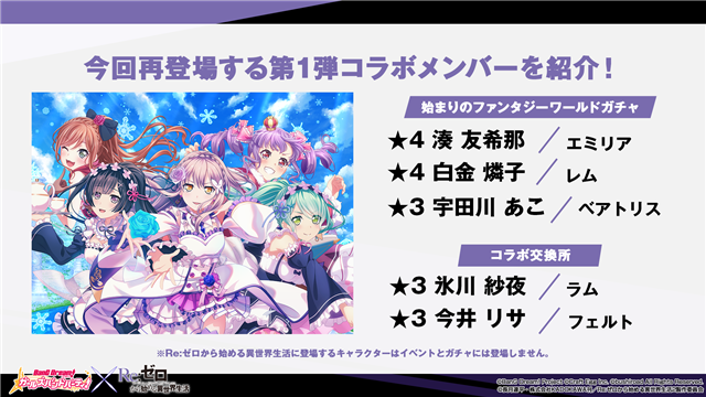 ※「Re:ゼロから始める異世界生活」に登場するキャラクターは、「バンドリ! ガールズバンドパーティ!」内のイベントストーリー、ガチャには登場しない。