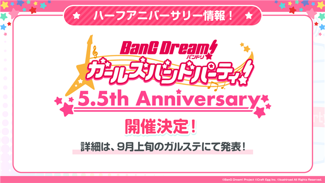 5.5周年記念ハーフアニバーサリー企画の開催が決定した。詳細にいては、9月上旬に予定している公式生放送にて発表予定。続報を待とう。