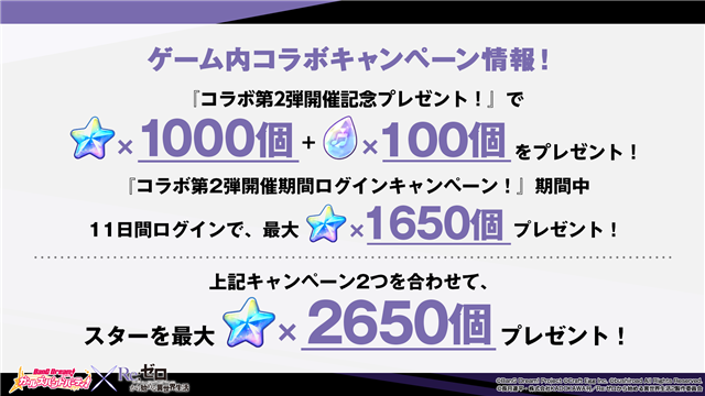 8月20日15時より、「Re:ゼロから始める異世界生活」とのコラボレーション企画第2弾を記念したログインキャンペーンを開催する。キャンペーン開催期間中、ゲームにログインした方全員に、「スター×1000」と「音色のクリスタル×100」をプレゼントするほか、期間中に11日間ログインされた方に最大「スター×1650」をプレゼントで、最大で合計「スター×2650」をプレゼントする。