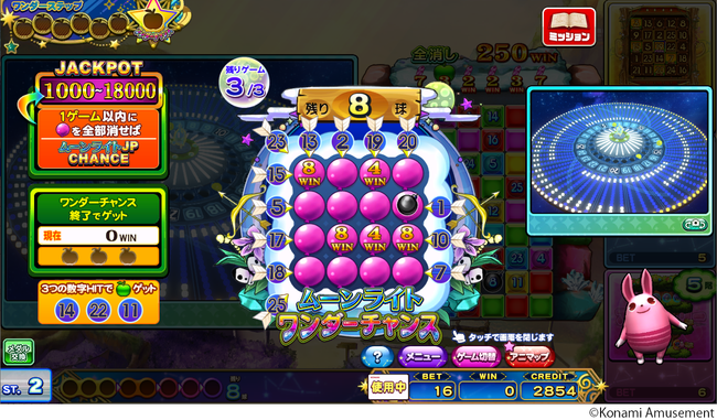 画面内に表示された風船を割っていくワンダーチャンス。抽選で画面に表示された数字がHITすると矢が発射され、 風船が一気に割れる。1ゲームの間に全ての風船を割ると、 「ムーンライトJACKPOT CHANCE」が獲得できる。