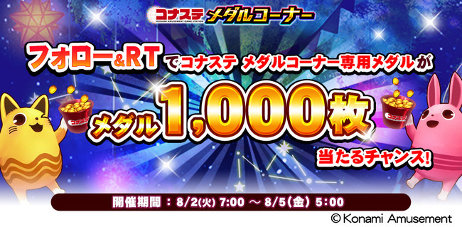 KONAMIメダルゲーム通信(@573_medal_game)をフォローし、 該当のツイートをリツイートした方の中から抽選で50名に、 『コナステ』で使えるメダルを1,000枚プレゼント!