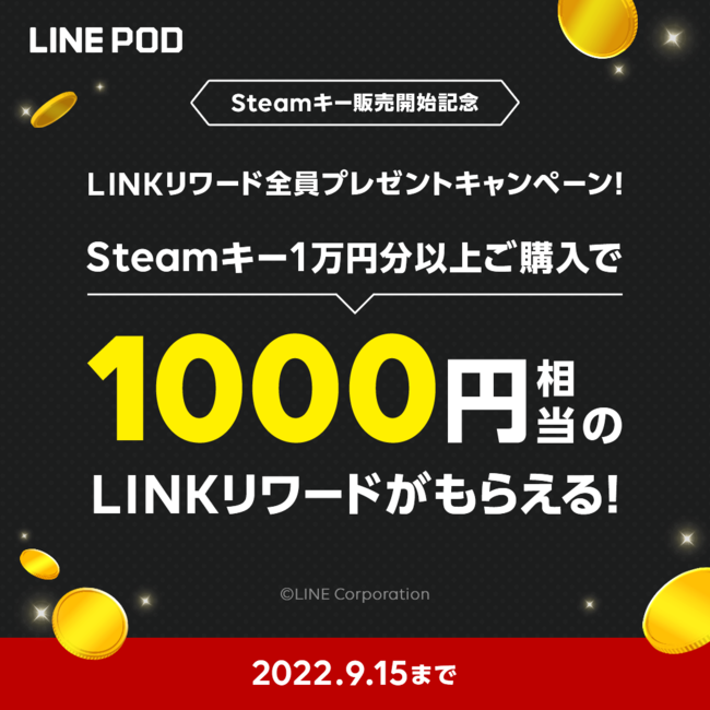 また、 「Steamキー」の販売を記念して、 「LINE POD」で1万円(LINE PODコイン1万枚相当)以上「Steamキー」をお買い上げのすべての方に1,000円相当分のLINKリワード※3をプレゼントするお得な“大還元祭”も同時開催いたします。