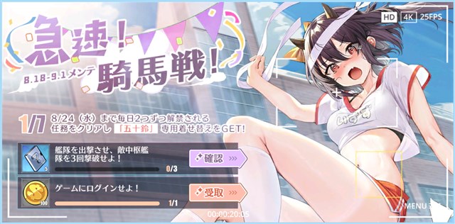 8月18日から8月24日までの期間、毎日開放される限定任務をクリアして、五十鈴の限定着せ替え「駿馬?と共にいざ!」と報酬アイテムを入手しよう!