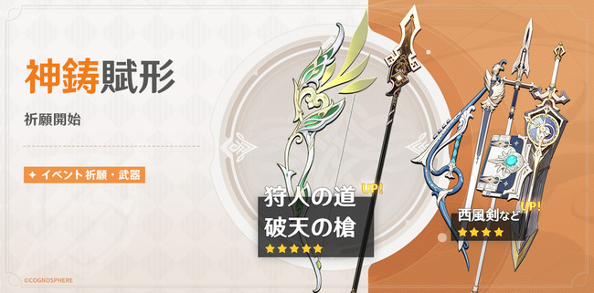 8月24日(水)アップデート後より、 イベント祈願・武器「神鋳賦形」を開催。期間中、 新★5武器「弓・狩人の道」、 ★5武器「長柄武器・破天の槍」などの出現率が大幅にUPする。