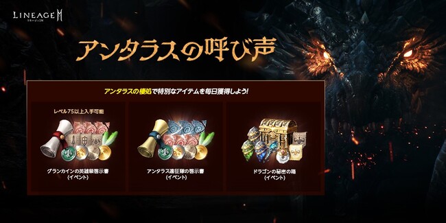 期間中、 マスター ダンジョン「アンタラスの棲処」のロビーに出現するイベントNPC「エリカ(イベント)」から「アンタラス遠征隊の啓示書(イベント)」「ドラゴンの秘密の箱(イベント)」をアデナで獲得することができます。 さらにレベル75以上のキャラクターの場合は「グランカインの英雄級啓示書(イベント)」をアデナで獲得することが可能です。