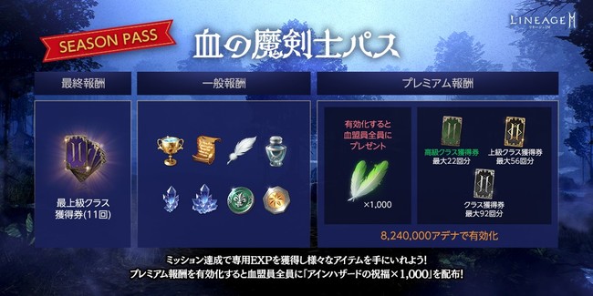 また、 8,240,000アデナを使用することでプレミアム報酬を有効化することができます。イベントの詳細は公式サイトのお知らせをご確認ください。