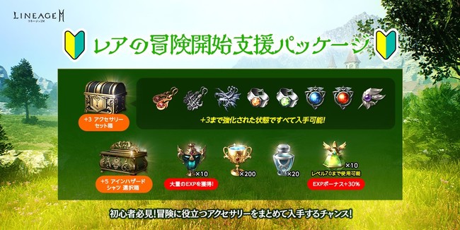 「+3アクセサリー セット箱(刻印)」1個、 「+5アインハザード シャツ選択箱(刻印)」1個、 「信念の快速成長のウィンド ポーション(レベル70)」10個などがセットになった「レアの冒険開始支援パッケージ」が登場しました。