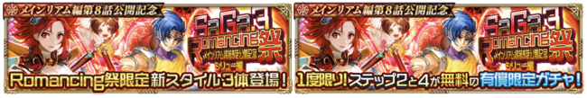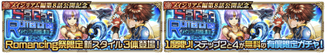 新ガチャ「メインリアム編第8話公開記念 Romancing祭 デューン編」を開催。本ガチャでは、 通常ガチャと有償ジュエルで実行できるステップガチャの2種類が用意されている。