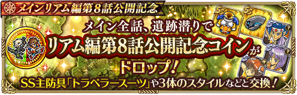 期間中、 「メイン全話」「遺跡潜り全種」でリアム編第8話公開記念コイン[期間限定]がドロップ。リアム編第8話公開記念コイン[期間限定]を集めると、 交換所でSS主防具「トラベラースーツ」やS[おとこともだち]ポルナレフを含めた3体のスタイルなどが獲得できる。