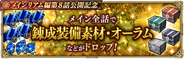 期間中、 メイン全話で瑠璃シリーズおよび、 他シリーズの錬成装備素材BOXとオーラムが追加ドロップする。詳細はゲーム内お知らせを参照。