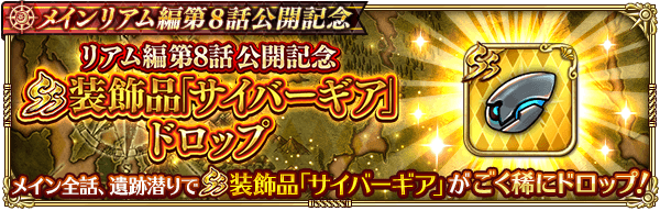 期間中、 「メイン全話」「遺跡潜り全種」でSS装飾品「サイバーギア」がごく稀にドロップする。
