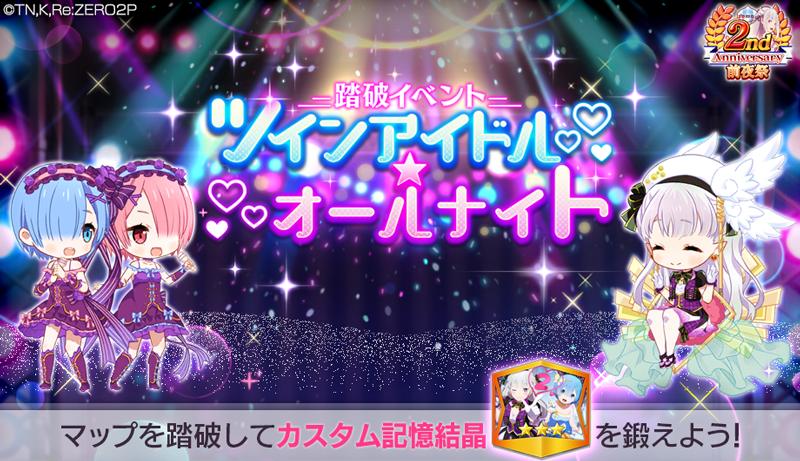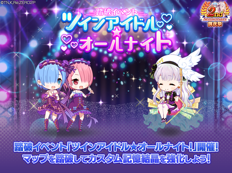 また、踏破イベント「ツインアイドル★オールナイト!」の特効を持ったキャラクター「【軽やかな歌謡】エミリア★3」が新登場する「2周年特別ガチャ【軽やかな歌謡】」も同時開催。