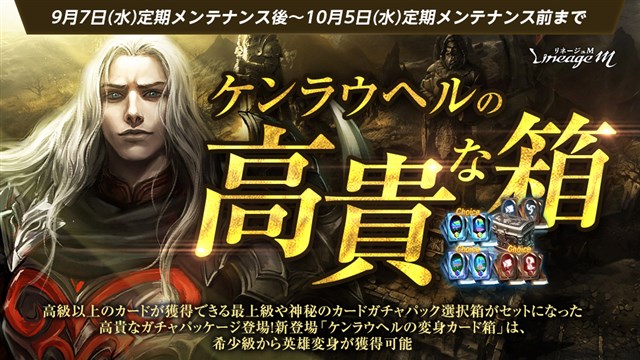 使用すると定められた確率で希少級~英雄級変身カードが獲得できる「ケンラウヘルの変身カード箱」と、変身かマジックドールを選択してガチャ券を獲得できる「最上級カードガチャパック選択箱」、「神秘のカードガチャパック選択箱」、「上級カードガチャパック選択箱」を複数個獲得でき、更に職業に対応した一般~英雄級のスキルカードがそれぞれ定められた確率で獲得できる「スキルカードガチャパック箱(イベント)」がセットになった「ケンラウヘルの高貴な箱」が登場した。本パッケージは、1アカウントにつき毎月に2回まで購入できる。