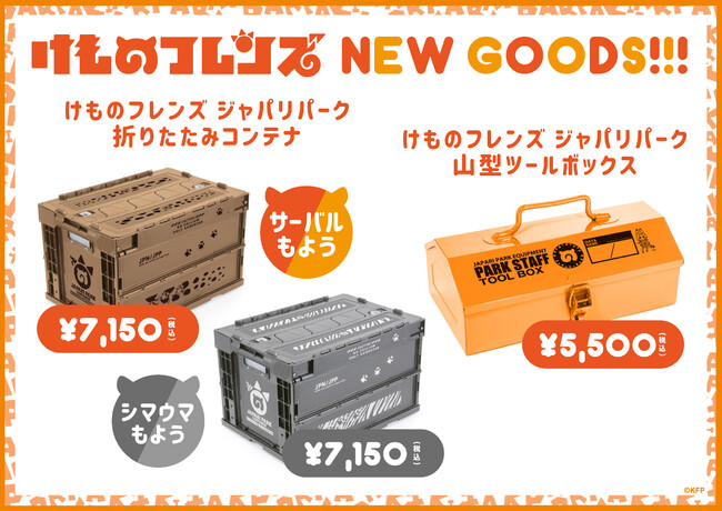新グッズには「けものフレンズ ジャパリパーク折りたたみコンテナ(サーバルもよう・シマウマもよう)」と「けものフレンズ ジャパリパーク山型ツールボックス」が登場するほか、 キービジュアルを使用した「けものフレンズ3 3周年バッジセット」と「けものフレンズ3 3rd ANNIVERSARY SHOP B2ポスター」の販売も。