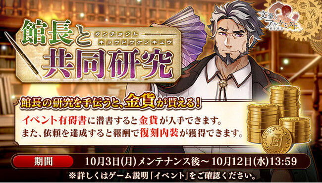 館長の研究を手伝うと金貨が貰えるイベント『館長と共同研究』を開始した。 本イベントでは、 期間限定アイテム「館長の依頼」を使用することで、 金貨を獲得できる専用の有碍書に潜書することができる。
