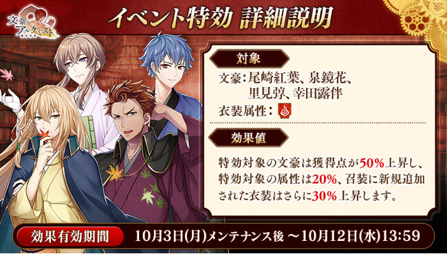 さらに、 イベントと同時に開催される限定召装『秋は紅葉と共に』にて新規追加された「尾崎紅葉」「泉鏡花」「里見弴」の〈紅葉衣装〉を編成すると、 得点の獲得率がそれぞれ30%上昇する。
