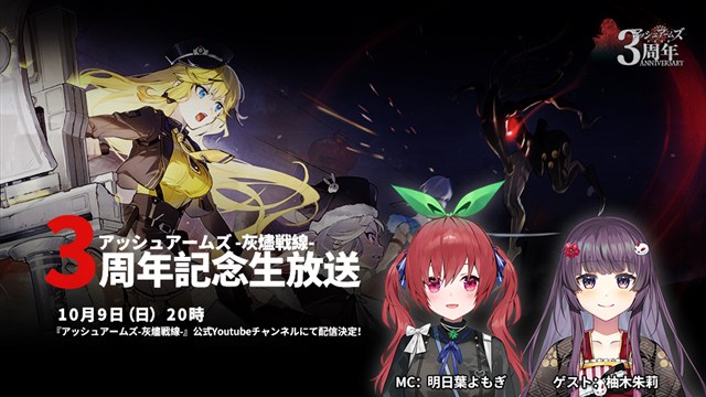 『アッシュアームズ』B1bis役の明日葉よもぎさんがMCを務め、ゲストに一式陸攻一一型役の柚木朱莉さんを迎え、新機能や新登場DOLLS メインストーリー更新など三周年の最新情報を届ける。そしてボイス実装予定のないシナリオの生アフレコも三周年記念放送限定で披露する。ほかにもステージ挑戦やGIF抽選など面白い企画をたくさん用意している。