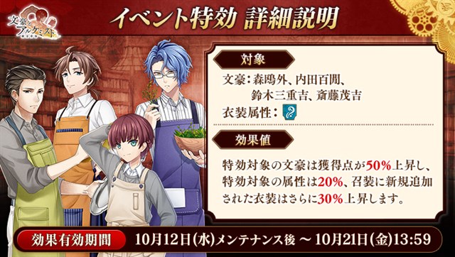 文豪の「衣装」や、会派に装備する事で能力を強化できる「装像」などが入手できるコンテンツ「召装」に、限定召装「甘いお菓子に思いを込めて」が期間限定で登場する。この召装では、イベント『調査任務「甘いお菓子に思いを込めて」』で活躍する「内田百閒」「鈴木三重吉」「斎藤茂吉」の新衣装を一定の確率で入手できる。また、10回召装が通常3000帝國券のところ、初回のみ1500帝國券で利用可能なキャンペーンを実施中!