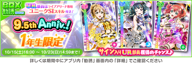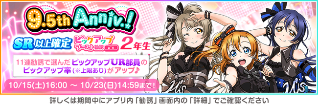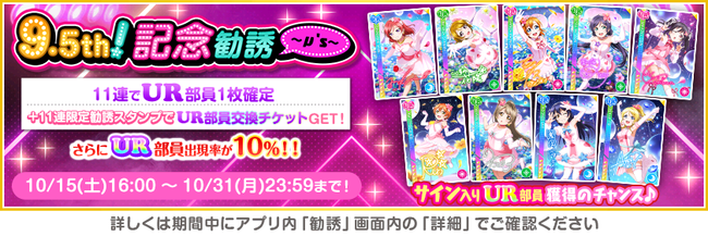 スクフェス9.5周年を記念して、 10/15 16:00以降にログインしていただいた全ての皆さまに控え室の部員枠100人分をプレゼントいたします!