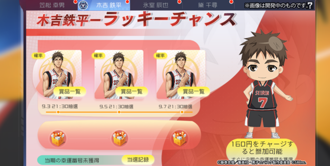 ▶幸運値が200に達した際に、 まだ選手「木吉鉄平」を獲得していない場合、 次の抽選で必ず「木吉鉄平」を入手できます。