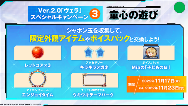 フィールド上にあるシャボン玉を集めることで、限定外観アイテムやボイスパックなどと交換できる。激レアな「レッドコア」x3個をもらえるほか、Mi-aの可愛い声で癒される「ヴェラ」の毎日を送りたい人は参加しよう。