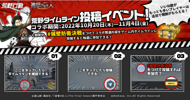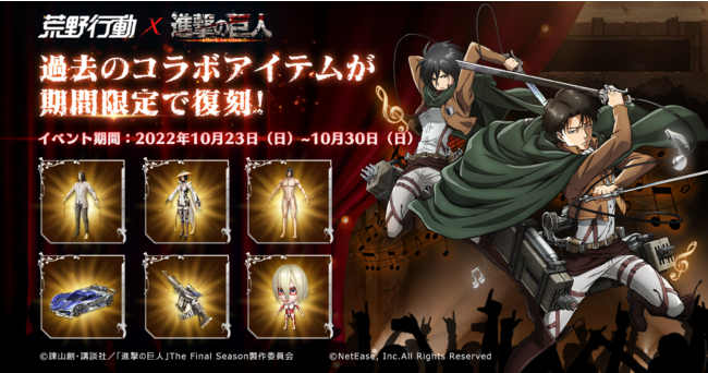 NetEase Gamesは、開発・運営する大人気バトルロワイヤルゲーム『荒野行動』で、10月20日~11月4日の期間中、『進撃の巨人』とのコラボイベント第6弾を開催する。
