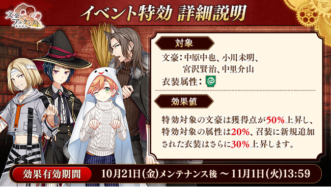 さらに、 イベントと同時に開催される限定召装「ほんとうのさいわいを探して」にて新規追加された「中原中也」「宮沢賢治」「中里介山」の〈ハロウィン衣装〉を編成すると、 得点の獲得率がそれぞれ30%上昇する。