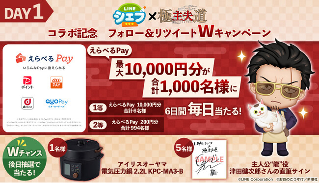 10/25(火)より、 合計1,000名様に「えらべるPay」最大10,000円分が当たる「LINE シェフ」公式Twitterフォロー&リツイートキャンペーンを開催する。 6日間連続で開催され、 1日1回、 「えらべるPay」がその場であたる抽選に毎日チャレンジできる。 さらに、 後日抽選で主人公「龍」役の声優・津田健次郎さんの直筆サインなどが当たるWチャンスも。