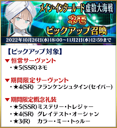 「メイン・インタールード 虚数大海戦イマジナリ・スクランブル ~ノーチラス浮上せよ~」に関連するサーヴァントの中から期間限定サーヴァント「★5(SSR)ヴァン・ゴッホ」「★4(SR)フランケンシュタイン(セイバー)」「★4(SR)源頼光(ランサー)」と、「★5(SSR)ネモ」の 4 騎のサーヴァントをピックアップする2種類の召喚を開催する。さらに、2020年の「虚数大海戦ピックアップ召喚(日替り)」にて登場した期間限定概念礼装「★5(SSR)ミステリー・トレジャー」「★4(SR)グレイテスト・オーシャン」「★3(R)カラー・ミー・トゥルー」をピックアップする。
