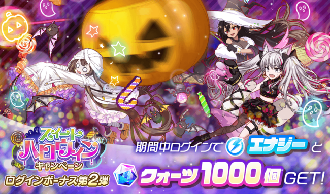「スイートハロウィンキャンペーン」ログインボーナス第2弾を開催。開催期間中にログインすると、 クォーツを合計1,000個とエナジーをプレゼント!期間中、 毎日ログインして、 報酬を獲得しよう。