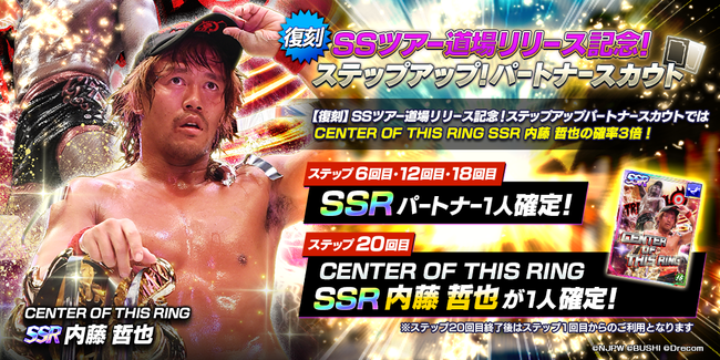 - SSツアー道場リリース記念限定SSRパートナー「[CENTER OF THIS RING]内藤哲也」が復刻登場となる、 復刻ステップアップパートナースカウトが開催中!