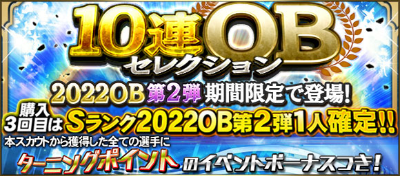 ※ 本スカウトはSランク確定スカウトではありません。10連スカウトの購入3回目に限り、10人中1人がSランクの「2022 OB第2弾」確定になります。ランクごとの登場割合は、スカウトページ内にある本スカウトの「説明」をタップして「登場選手」タブ内に表示される「登場割合」をご確認ください。