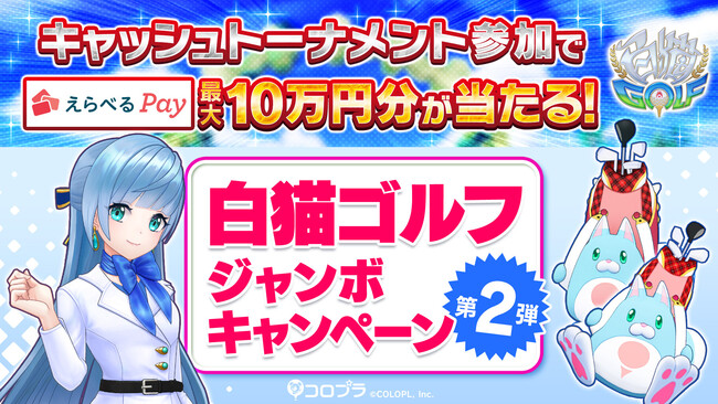 「キャッシュトーナメント」開催を記念して、 1次予選に参加するだけで、 最大10万円分の「えらべるPay」が当たる「白猫GOLFジャンボキャンペーン」第2弾が開催中です。 参加条件を満たすとキャンペーン事務局からゲーム内で個別にメッセージが届きます。 メッセージ内に記載されたURLから抽選にご参加ください。