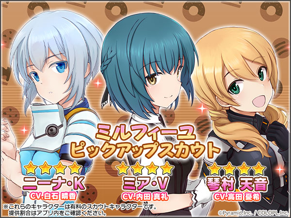 イベントに登場する「ミア・ヴォワザン(CV:内田 真礼)」、「ニーナ・カリーニナ(CV:白石 晴香)」、「琴村 天音(CV:高田 憂希)」の3名のノーマル★4キャラクターをピックアップしたスカウトが開催中。