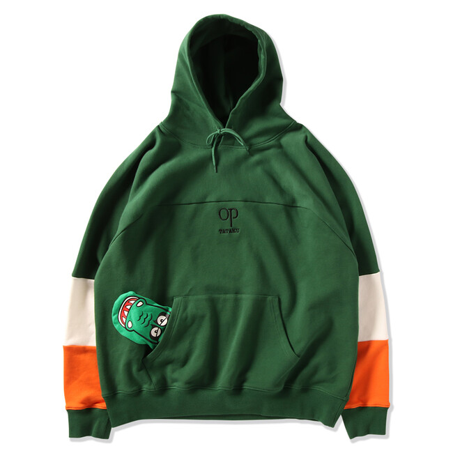大きめサイズのたっぷりシルエットのパーカです。 ポケットの中から、 手を入れればガブガブさせることができるギミック付き。 胸元には「叩く」の字をデザインしており、 背面には、 両肩にワニワニパニックとパンクドランカーズのロゴが入っています。 ミトン仕様のワニは、 カンガルーポケットに隠すこともできます。