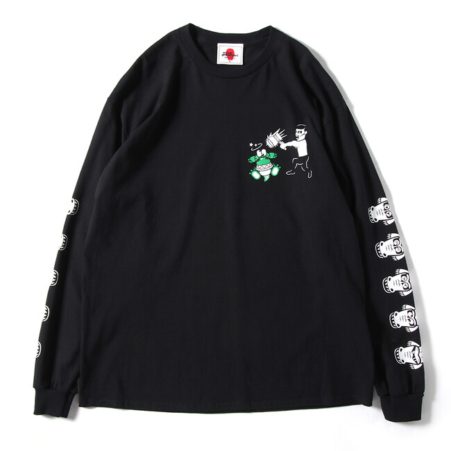 パンクドランカーズのメインキャラクター「アイツ」に叩かれて、 バタンキュ~なワニが胸元にプリントで入った可愛いロンTEEです。 袖のワニたちはゲームに沿ってそれぞれ表情が異なります。 背面には、 ハンマーをクロスにすることで、 ワニワニパニックxパンクドランカーズとコラボを演出しています。