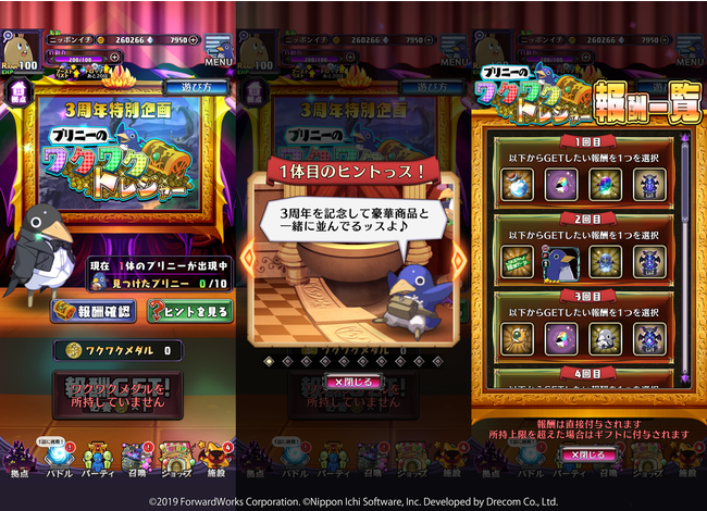 合わせて、 3周年を記念した特別企画や9つのキャンペーンを実施。 最大200体のキャラクターを無料で入手できるプレミアム&プラチナム召喚(ガチャ)やゲーム内で宝探しをして好きなアイテムを獲得できる「プリニーのワクワクトレジャー」、 特別なアイテムがもらえるログインボーナスなど、 この機会にゲームを始めても楽しめるキャンペーンが満載となっている。
