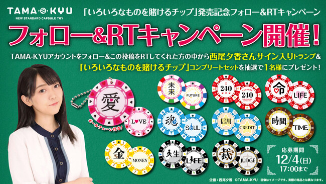 現在、TAMA-KYU(タマキュー)公式Twitterにて西尾夕香さんサイン入りトランプと「いろいろなものを賭けるチップ」コンプリートセットが当たるキャンペーンを開催中。