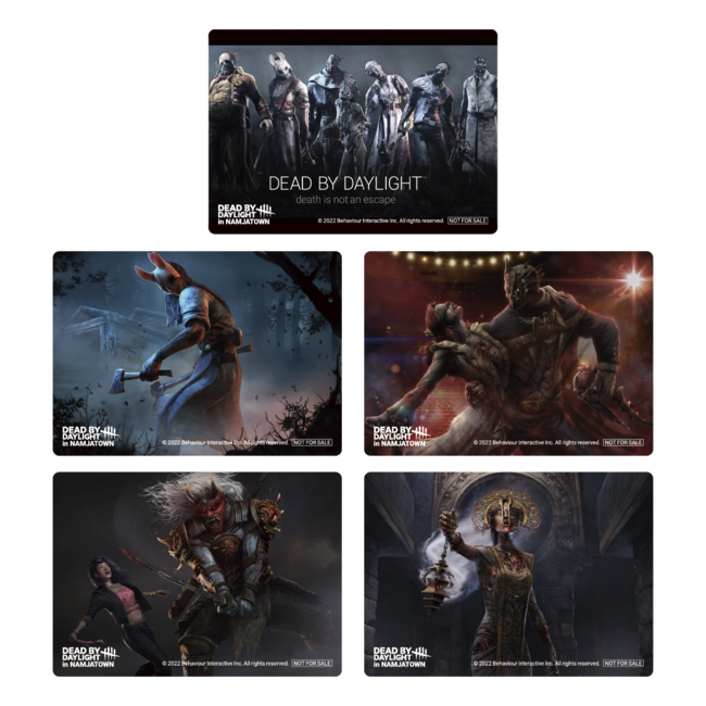 コラボ限定イラストを使用したオリジナルグッズを販売します。『Dead by Daylight』関連商品を1会計につき税込2,000円お買い上げごとに、イラストシート(全9種/ランダム配付)が1枚もらえます。オリジナルグッズはイベント会場と「ナムコパークス オンラインストア」でお買い求めいただけます。
