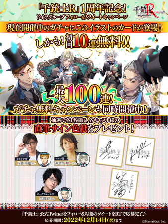 ドイツグループのピックアップガチャの開催にあわせて、『千銃士』公式Twitterアカウントでは佐藤拓也さん(ドライゼ役)、諏訪部順一さん(エルメ役)、笠間淳さん(ジーグブルート役)の直筆サイン色紙が抽選で各1名に当たるフォロー&リツイートキャンペーンを開催中。応募の締切は2022年12月14日(水)23:59まで。