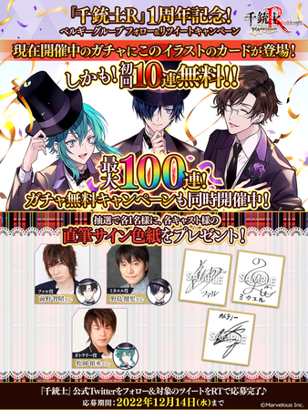 ベルギーグループのピックアップガチャの開催にあわせて、『千銃士』公式Twitterアカウントでは前野智昭さん(ファル役)、野島健児さん(ミカエル役)、松岡禎丞さん(カトラリー役)の直筆サイン色紙が抽選で各1名に当たるフォロー&リツイートキャンペーンを開催中。応募の締切は2022年12月14日(水)23:59まで。