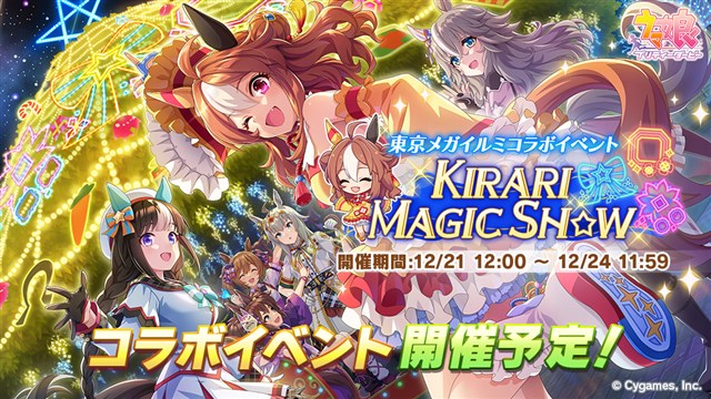 12月21日12時より、東京メガイルミコラボイベント「KIRARI MAGIC SHOW」の開催を予定している。本イベントは、コパノリッキー、ホッコータルマエ、ワンダーアキュートの3人が活躍するゲーム内イベントとなっている。詳細はお知らせにて順次公開する。