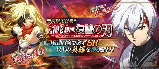 『孤独な復讐の刃』は10連召喚で必ずSR以上の英雄を一人獲得できる、期間限定召喚です。SSR漂泊の闘士、SSRユリアンの出現確率が期間限定でアップする。