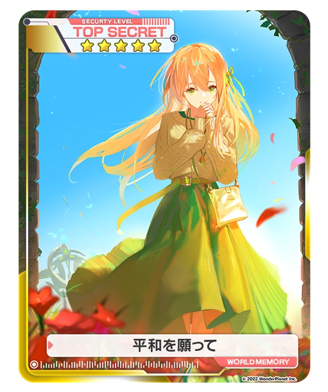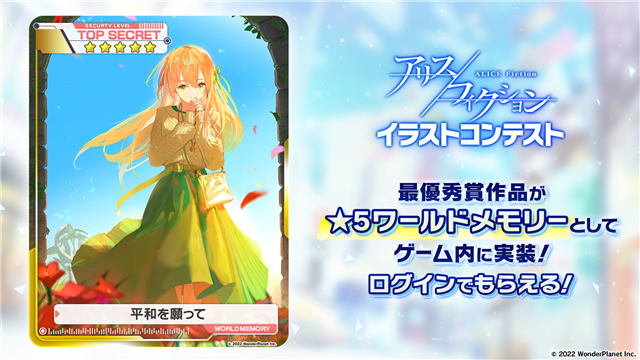 『アリスフィクション』イラストコンテストで最優秀賞を受賞された澄夜 咲星さんの作品が★5ワールドメモリーとしてゲーム内に実装される。期間中、ログインすると★5ワールドメモリー「平和を願って」がもらえる。
