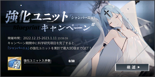キャンペーン期間中に科学研究項目を完了すると、特別計画艦「シャンパーニュ」の強化ユニットを累計で最大30個まで入手可能。特別計画艦「シャンパーニュ」の育成に役立てよう!