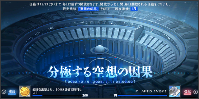 12月15日~12月21日まで毎日新しい任務が開放され、前の任務をクリアすると、次の任務が出現するようになる。期間限定任務をクリアし、限定装備「夢雪の幻界」と報酬アイテムを入手しよう!