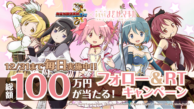 『麻雀格闘倶楽部Sp』公式Twitterアカウントにて、『麻雀格闘倶楽部Sp』×「劇場版 魔法少女まどか☆マギカ」コラボを記念したフォロー&RTキャンペーンを12月19日(月)~12月31日(土)に開催します。