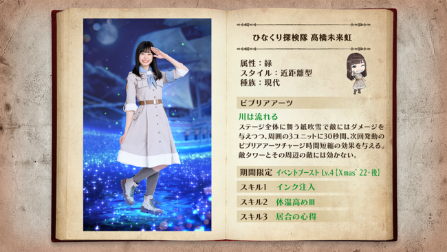 強力なフリーズ耐性持ち!新たなジョブ「★4 ひなくり探検隊」が登場。ステージ全体に舞う紙吹雪で敵にはダメージを与えつつ、周囲の3ユニットに30秒間、次回発動のビブリアアーツチャージ時間短縮の効果を与えるビブリアアーツ「川は流れる」を所持している。さらに新たな特効おまもりも登場。