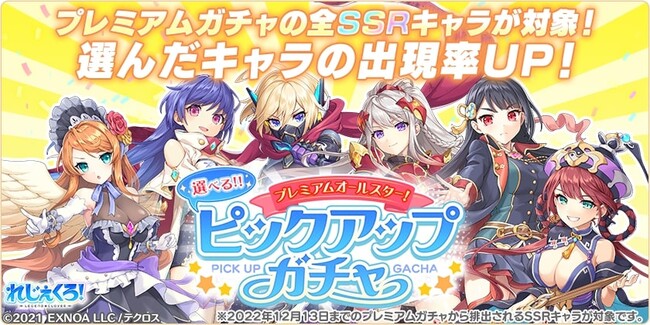 現在「プレミアムオールスター!選べるピックアップガチャ」が開催中!プレミアムガチャから出現するSSRキャラの中から、好きなキャラを2体選択し、選んだキャラの出現率が上昇するガチャです!