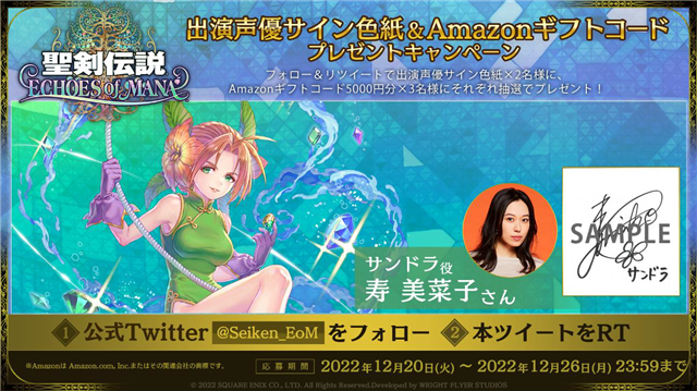 『聖剣伝説 Legend of MANA』キャラクター達の登場を記念して、抽選でサンドラ役「寿美菜子」さんのサイン色紙または「Amazonギフト券5000円分」が抽選で当たるTwitterフォロー&リツイートキャンペーンを実施する。